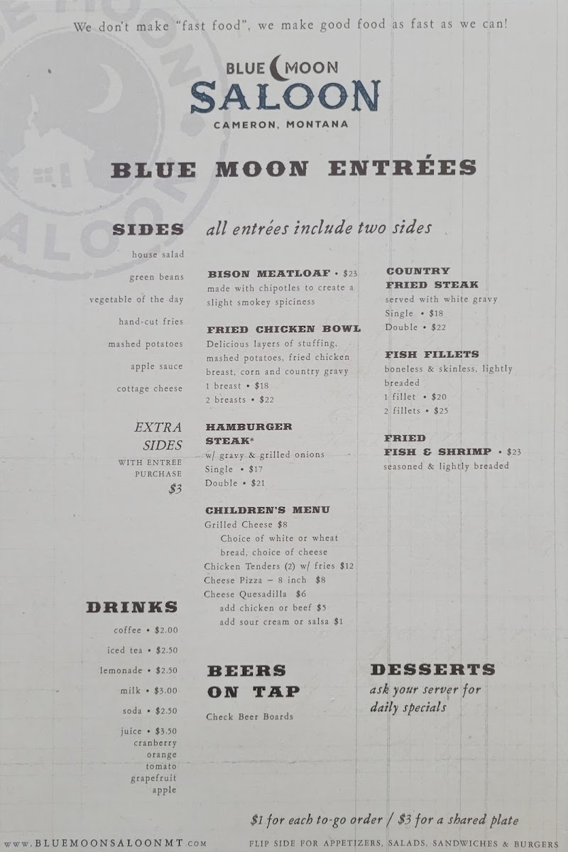 Welcome to Blue Moon Saloon, an inviting eatery nestled at 3793 US-287 in Cameron, MT. This charming spot boasts a menu designed to satisfy all cravings, from fresh garden salads to hearty taco salads. For a delightful drink, choose from coffee, iced tea, lemonade, milk, or classic soda. Notably, patrons rave about the mouthwatering smash burger and tantalizing mozzarella sticks, making it the perfect destination for food lovers.